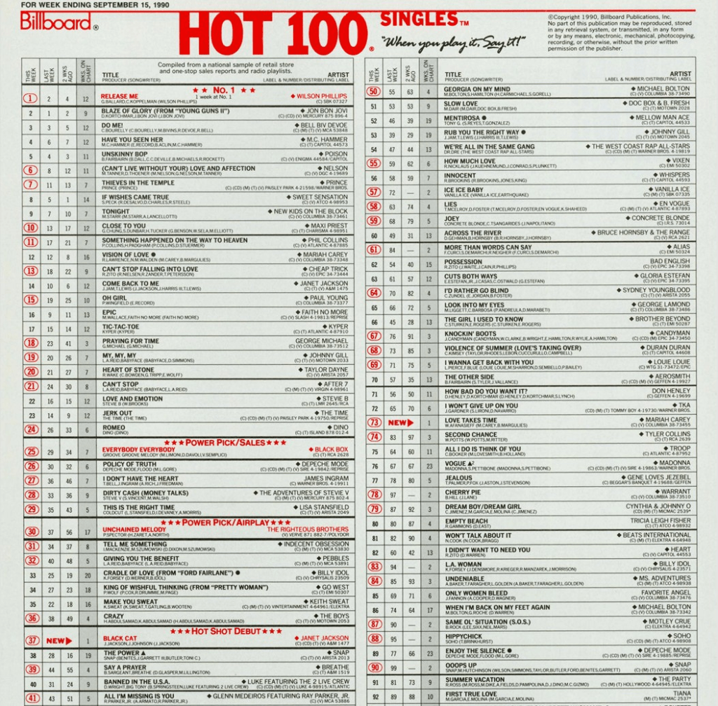 Wow, this Hot 100 countdown is crazy. As this is late 1990, it’s not surprising that a lot of the 80s spills over into the 90s. But seriously how many boy bands did the early 90s really need. A lot of dance music from the 80s also showed up in the 90s. Also so called hair metal was still relatively prevalent on this chart. Little did the hair metal bands know that bands such as Nirvana and Pearl Jam are just around the corner.